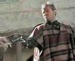 He throws an unresisting Buck into the street beyond. Buck rolls over and over and then comes up on his knees and taunts Chris who is levelling a gun at his chest.